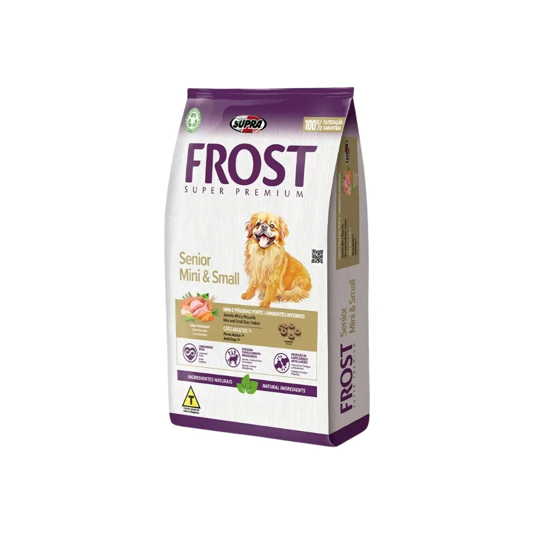 A Ração Frost Senior para Cães Adultos Mini e Small é um alimento Super Premium (7+ anos) desenvolvido para pequenos idosos. Possui grãos adaptados para facilitar a mastigação, antioxidantes naturais para o envelhecimento celular, além de glicosamina e condroitina para saúde articular, garantindo energia equilibrada.