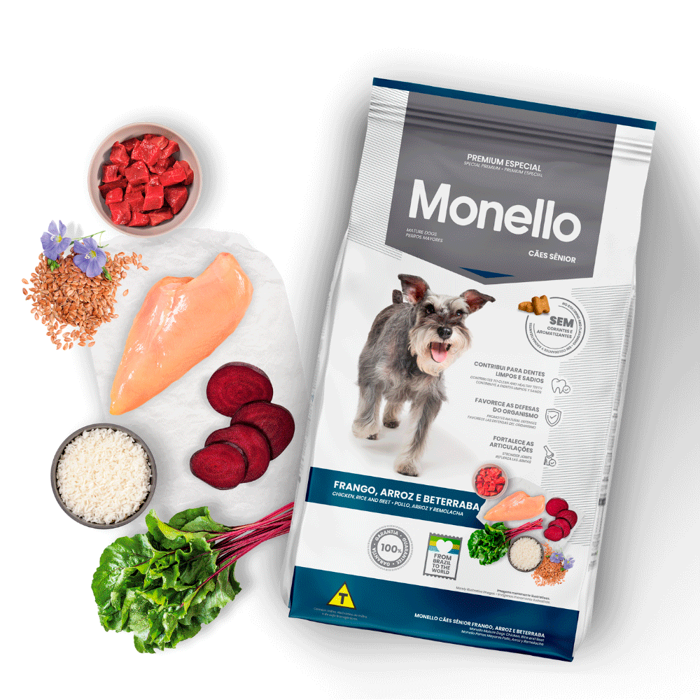 A ração Monello Premium Especial Cães Sênior é um alimento de alta qualidade, sabor frango, arroz e beterraba, desenvolvido para cães acima de 7 anos. A fórmula oferece 25% de proteína, condroitina e glicosamina para articulações, além de hexametafosfato para saúde bucal. É livre de corantes artificiais, auxiliando na longevidade e digestão.