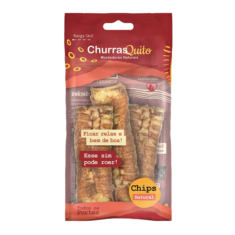 O ChurraQuito Chips naturais é um petisco canino crocante, feito de vísceras bovinas desidratadas, rico em proteínas e cálcio, sem conservantes ou sódio, ideal para cães de todos os portes, ajudando no fortalecimento da arcada dentária, controle do tártaro e do mau hálito, sendo uma opção saudável para distração e bem-estar.