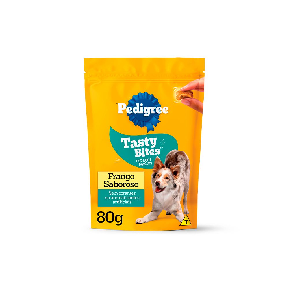 – Indicado para cães; – Petisco Pedigree Tasty Bites para Cães Adultos Sabor Frango Saboroso; – Indicado para todas as raças e portes.