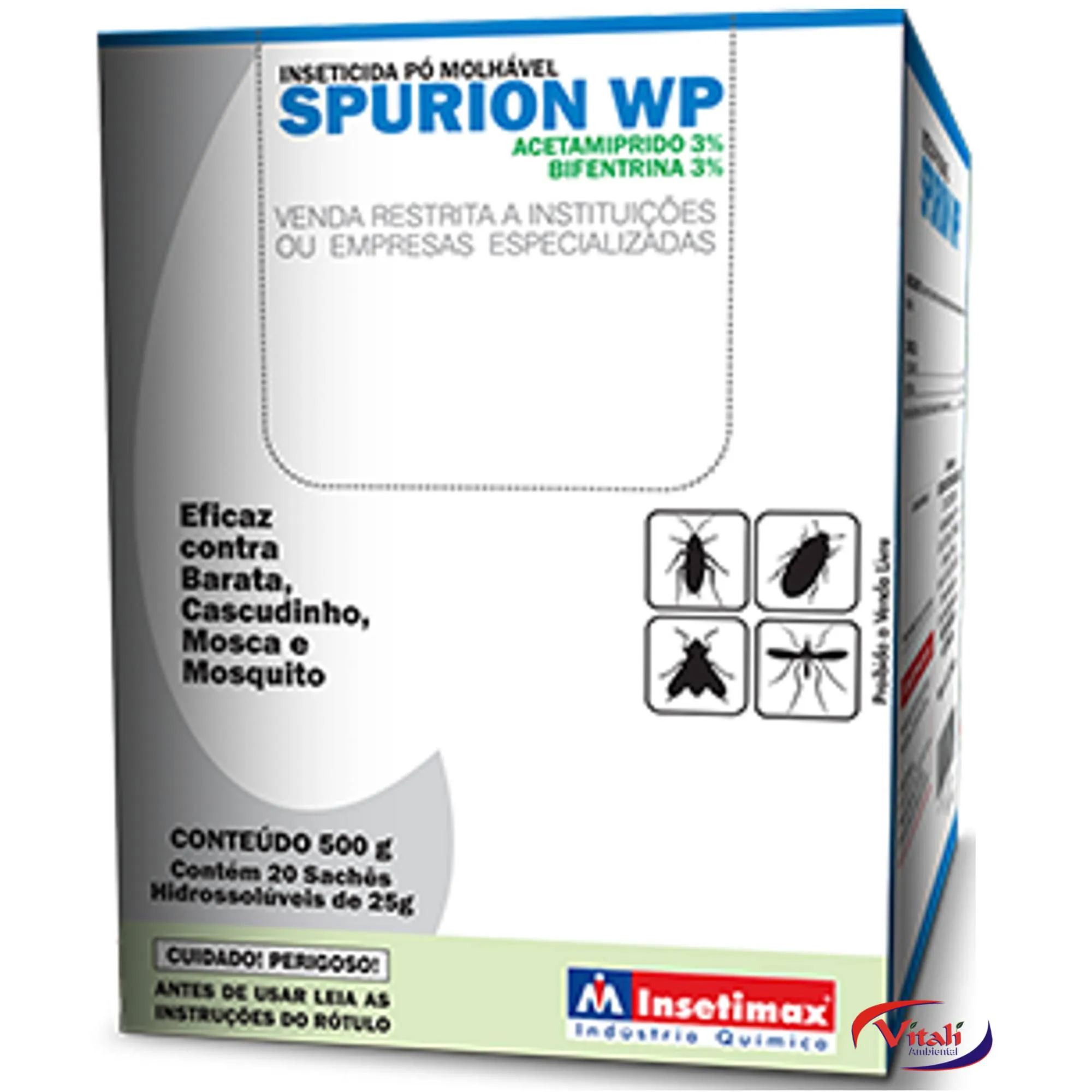 O Spurion WP 25g é um inseticida em pó molhável de alta eficácia, formulado com Bifentrina (3%) e Acetamiprido (3%), indicado para controle de moscas, mosquitos (incluindo Aedes aegypti) e baratas. Possui sachês hidrossolúveis que facilitam o manuseio, baixa irritabilidade, alta aderência em superfícies e excelente custo-benefício para uso profissional e em granjas.
