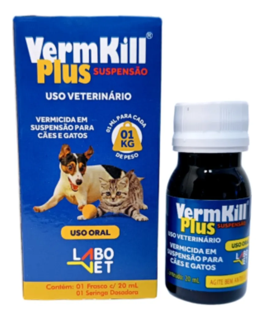 O Vermkill Plus Suspensão 20ml é um vermífugo oral de amplo espectro para cães e gatos, eficaz no combate aos principais parasitas gastrointestinais (nematódeos e cestódeos) que afetam esses animais. O produto é fabricado pela Labovet e vem em um frasco de 20 mL com seringa dosadora.